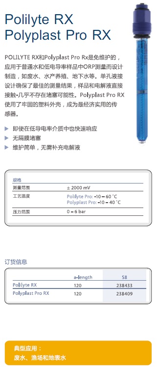 POLILYTE RX和Polyplast Pro RX是免維護的,,應(yīng)用于普通水和低電導(dǎo)率樣品中ORP測量而設(shè)計制造,,如廢水、水產(chǎn)養(yǎng)殖、地下水等。單孔液接設(shè)計確保了最佳的測量結(jié)果,,樣品和電解液直接接觸-幾乎不存在堵塞可能性。Polyplast Pro RX使用了牢固的塑料外殼,,成為最經(jīng)濟實用的傳感器。