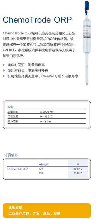 ChemoTrode ORP是可以應(yīng)用在制藥和化工行業(yè)過(guò)程中的最耐受苛刻測(cè)量要求的ORP傳感器。該傳感器有一個(gè)加液孔可以添加電解液并可外加壓,,EVEREF-F參比系統(tǒng)確保參比電解液保持無(wú)銀離子和蛋白質(zhì)沉淀。