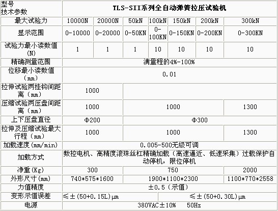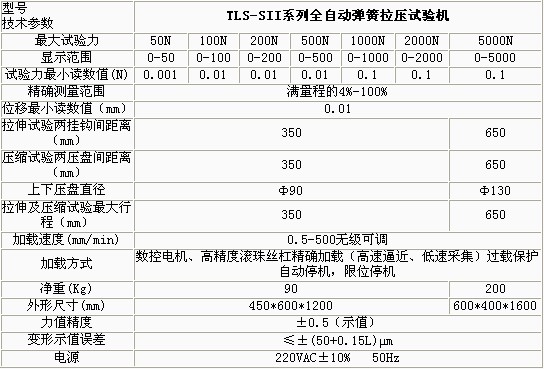 產(chǎn)品概述: TLS-SII系列全自動數(shù)顯式拉壓試驗機是適用于拉壓試驗的新型試驗設(shè)備。試驗機主機的設(shè)計具有外形美觀、操作方便、性能穩(wěn)定可靠的特點。試驗機 采用數(shù)控電機及先進的單片機控制技術(shù)加載及控制,彎曲扭轉(zhuǎn)試驗機,能實現(xiàn)雙速預(yù)置。實現(xiàn)了高速逼近,低速采集。提高了測試精度,數(shù)控彈簧試驗機,保證了試驗效率。 功能特點: 自動變速檢測5個測試點,并自動返回到試驗初始位置 LED顯示,人機對話直觀明了便于操作 可以選擇多種測試方法,順次自動完成一批工件的測試,可查看已測數(shù)據(jù) 傳感器引起的變形量可以補償,既傳感器和整機剛度引起的變形不影響位移精度。 可實現(xiàn)試驗力、試驗速度、位移等多種控制方式,具有以下功能: 設(shè)定變形量F,手動雙數(shù)顯彈簧拉壓試驗機,檢測彈簧的試驗力P; 設(shè)定彈簧的剩余高度H,檢測彈簧的試驗力P; 彈簧變形的檢測已工作壓盤接觸彈簧為準,此時試驗力有反應(yīng),試驗力(初始力)的大小任意設(shè)定。 技術(shù)參數(shù):
