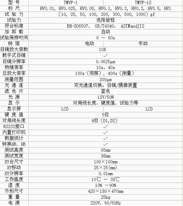 產(chǎn)品概述: • TMVP-1/TMVP-1S大屏數(shù)顯自動(dòng)(手動(dòng))轉(zhuǎn)塔顯微維氏硬度計(jì)該機(jī)采用計(jì)算機(jī)軟件編程,高倍率光學(xué)測量系統(tǒng),,光電傳感等技術(shù),通過軟鍵輸入,能調(diào)節(jié)測量光源的強(qiáng)弱等。 • 適用于測量微小、薄形試件、表面滲鍍處理后的零件和對瑪瑙、玻璃、陶瓷等脆性材料的顯微和努氏硬度的測定 以及涂層、表面覆層、層壓金屬、熱處理碳化層和淬火硬化層的深度與硬度梯度的測定。是科研機(jī)構(gòu)、工廠及質(zhì)檢部門進(jìn)行研究和檢測的理想的硬度測試儀器。 功能特點(diǎn): • 操作面板的LCD屏幕上能預(yù)置試驗(yàn)力保持時(shí)間、選擇維氏和努氏試驗(yàn)方法、對照表、文件號與儲(chǔ)存等• 通過軟件輸入,,光源的強(qiáng)弱自動(dòng)調(diào)節(jié),并選擇維氏和努氏試驗(yàn)方法、保持時(shí)間、文件號、儲(chǔ)存等。 • 顯示測量壓痕長度、硬度值、試驗(yàn)力保持時(shí)間,轉(zhuǎn)換值、測量次數(shù)和年、月、日及時(shí)間等。 • 試驗(yàn)結(jié)果和數(shù)據(jù)處理,并通過打印機(jī)輸出,,還能通過RS232接口與計(jì)算機(jī)連網(wǎng)。 • 硬度計(jì)還可根據(jù)用戶特殊需求配置CCD圖像自動(dòng)測量裝置、視頻裝置和攝像裝置。能對所測壓痕和材料金相組織進(jìn)行拍攝。 技術(shù)參數(shù):