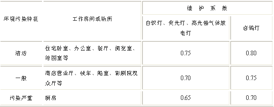 第2.1.4條 在照明設(shè)計(jì)時(shí)應(yīng)根據(jù)光源的光通衰減、燈具積塵和房間表面污染引起照度值降低的程度,除以表2.1.4中的維護(hù)系數(shù)。