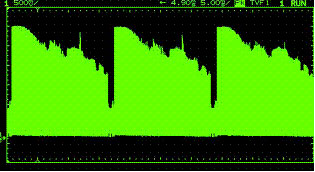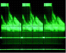 圖2是無(wú)Z軸亮度調(diào)制較老數(shù)字示波器的顯示。雖然該示波器甚至在5ms/div時(shí)仍有捕獲信號(hào)細(xì)節(jié)的足夠采樣率和存儲(chǔ)器深度但所有捕獲點(diǎn)的顯示亮度相同。這就在視覺(jué)上丟失了信號(hào)包絡(luò)內(nèi)的波形細(xì)節(jié)。因此在選擇模擬示波器技術(shù)還是選擇較老的數(shù)字顯示技術(shù)上不應(yīng)對(duì)今天視頻實(shí)驗(yàn)室中充斥模擬示波器感到驚奇!