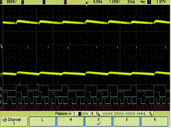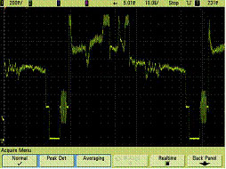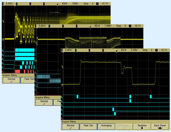 復(fù)雜模擬信號(hào)的另一例子是數(shù)字控制馬達(dá)驅(qū)動(dòng)信號(hào)。馬達(dá)不同時(shí)間的起動(dòng)周期可歸入單次現(xiàn)象。圖5示出采用高分辨率顯示技術(shù)的示波器如何可靠捕獲單次起動(dòng)馬達(dá)驅(qū)動(dòng)信號(hào)的一相。您也能用混合信號(hào)示波器的數(shù)字∕邏輯通道同步和觸發(fā)對(duì)基于馬達(dá)數(shù)字控制信號(hào)的波形捕獲。在您試圖同步對(duì)開(kāi)機(jī)序列或是對(duì)特定馬達(dá)定位命令的采集時(shí)這一能力是極端重要的。雖然圖中沒(méi)有示出但該示波器能使用它的4個(gè)模擬采集通道容易地同時(shí)捕獲馬達(dá)驅(qū)動(dòng)信號(hào)的所有三相。
