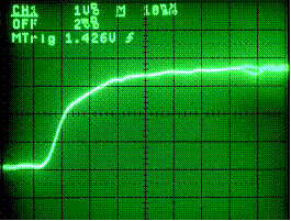 圖9是在模擬示波器上顯示的同樣信號(hào)。我們?cè)谶@里不能示出抖動(dòng)沿因?yàn)樗a(chǎn)生在觸發(fā)參考點(diǎn)(上升沿)之前。但能觀察到信號(hào)沿有時(shí)產(chǎn)生間歇毛刺。我們不能用模擬示波器觀察毛刺因?yàn)閷?duì)常規(guī)模擬示波器顯示而言它出現(xiàn)次數(shù)太少即使把顯示亮度調(diào)到最亮。
