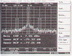 顯示的水平軸(頻率軸)中心頻率為900MHz,掃頻頻寬為1MHz,而每一小格代表l00kHz。頂部水平線表示0dBm,垂直方向每一格代表10dB。信號已經被衰減了10dB,測量顯示的功率電平已考慮了此衰減。