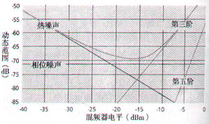 相鄰信道功率比(ACPR)或低電平IMD的測量要更困難,更需要注意頻譜分析儀的能力。圖2顯示了頻譜分析儀的熱噪聲、相位噪聲和第三、第五階交調失真與混頻器電平的關系。由于精確測量ACPR所需的動態(tài)范圍接近或超出了很多頻譜分析儀的性能極限,所以必須全面考慮之后才有把握進行正確測量。