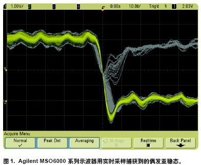 圖1 是用 Agilent's 6000 系列示波器捕獲到的毛刺該示波器甚至能在帶sin(x)/x重建時(shí)用實(shí)時(shí)采樣達(dá)到100,000 次/ 秒的波形更新。在這一更新率下示波器捕獲到該特用實(shí)時(shí)采樣捕獲亞穩(wěn)態(tài)定信號(hào)的統(tǒng)計(jì)概率約為每秒二次。采用專有MegaZoom III 技術(shù)的Agilent示波器實(shí)現(xiàn)了這一業(yè)內(nèi)領(lǐng)先的更新率。
