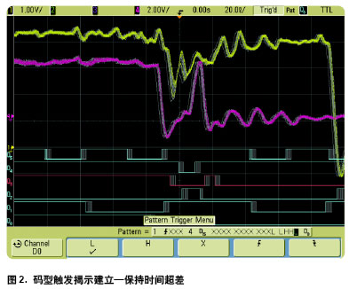 一旦我們發(fā)現(xiàn)電路存在非預(yù)期的行為就可開始進(jìn)一步調(diào)試我們的系統(tǒng)。使用混合信號(hào)示波器(MSO)的邏輯通道就能設(shè)置跨多個(gè)模擬和數(shù)字通道的組合邏輯碼型觸發(fā)條件。它揭示由于時(shí)鐘抖動(dòng)我們的系統(tǒng)偶爾出現(xiàn)對(duì)建立 保持時(shí)間指標(biāo)的超差如圖2 所示。