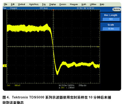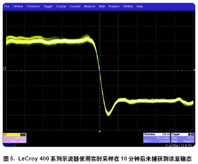 圖 4 是使用 Tektronix 高性能TDS5000 系列示波器的類似例子它有100,000 波形/ 秒的標(biāo)志性波形3用實(shí)時(shí)采樣捕獲亞穩(wěn)態(tài)(續(xù))更新率指標(biāo)。但由于其默認(rèn)的實(shí)時(shí)采集更新率被限制為只有60 波形/秒因此捕獲到該異常仍僅有很低的概率。雖然60 波形/ 秒對(duì)于示波器的“實(shí)況”感覺(jué)是足夠快的但為捕獲到僅僅一個(gè)毛刺需要把探頭放在測(cè)試點(diǎn)上的平均時(shí)間將近 14 分鐘。