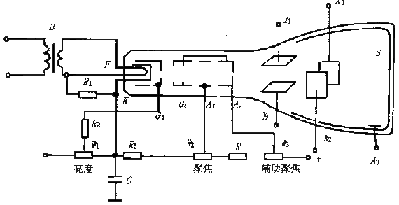 電子束從陰極奔向熒光屏的過程中經(jīng)過兩次聚焦過程。第一次聚焦由K、G1、G2完成K、K、G1、G2叫做示波管的第一電子透鏡。第二次聚焦發(fā)生在G2、A1、A2區(qū)域調(diào)節(jié)第二陽極A2的電位能使電子束正好會(huì)聚于熒光屏上的一點(diǎn)這是第二次聚焦。A1上的電壓叫做聚焦電壓A1又被叫做聚焦極。有時(shí)調(diào)節(jié)A1電壓仍不能滿足良好聚焦需微調(diào)第二陽極A2的電壓A2又叫做輔助聚焦極。