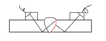 圖 1 對接焊焊縫余高未磨平、只能單面探測?墒褂眯碧筋^、觀察一次或二次回波在焊縫兩側(cè)進(jìn)行掃查探傷。