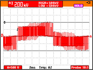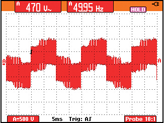 50 Hz馬達驅(qū)動輸出電壓的脈寬調(diào)制信號的細節(jié)。1000V,50 微秒的脈沖即導致某些測試設(shè)備的不穩(wěn)定。