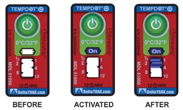 TempDot™Plus標簽應(yīng)存儲在室溫下,,并必須在反應(yīng)溫度閾值以上被激活。激活是通過用手指推壓。"On"字出現(xiàn)在第一個窗口中顯示激活。之后5分 鐘內(nèi),在反應(yīng)溫度或低于反應(yīng)溫度的情況下將標簽貼到產(chǎn)品上。藍色染料熔化并以控制的速率遷移,經(jīng)過白色大窗口。這表示暴露在溫度閾值以上的累計時間。當溫 度低于閾值時,,該染料固化并停止移動。如果溫度超過閾值,TempDot®Plus標簽提供即時的視覺跡象。