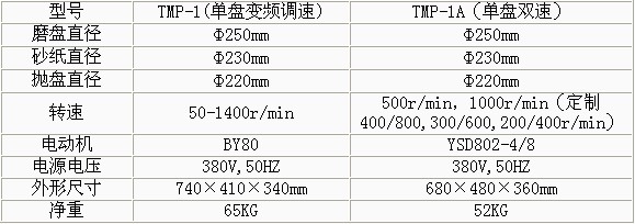 TMP-1單盤雙速金相試樣磨拋機(jī) •澳大利亞科學(xué)家smeuls提出凡是用固定磨料(如砂輪片、砂輪和金剛石磨盤以及各種砂紙)制備試樣的過程稱為磨光,金相切片研磨機(jī),凡是使用松散磨料(如加入各種磨料微粉懸浮液、噴霧拋光劑、拋光膏)制備過程稱為拋光。 •單盤雙速磨拋機(jī)(拋盤、研磨盤)就能完成各種試樣的粗磨、細(xì)磨、干磨、濕磨、研磨及拋光等各道工序。 •該機(jī)的磨拋盤直徑均大于國內(nèi)同類產(chǎn)品,全自動金相拋光研磨機(jī),有效增加工作面20-30%有更多不同線速度的選擇。 •本機(jī)可選擇安裝PD-1型推移器,金相試樣自動研磨機(jī),能替代手工進(jìn)行磨拋各道工序。 TMP-1A無級變速金相試樣磨拋機(jī) •變頻調(diào)速,金相樣品自動研磨機(jī),試驗范圍自行設(shè)定。 •只需調(diào)換磨盤或拋盤和選擇合適轉(zhuǎn)速即可粗磨、細(xì)磨、干磨、濕磨、研磨及拋光等各道工序。 •傳動功率、磨拋盤直徑均大于國內(nèi)同類產(chǎn)品,金相拋光研磨機(jī),可增加有效工作面20-30%,金相研磨機(jī),可適應(yīng)不同材料的制備要求。 •本機(jī)可選擇安裝PD-1型推移器,金相研磨機(jī)價格,能替代手工進(jìn)行磨拋各道工序。 技術(shù)參數(shù):