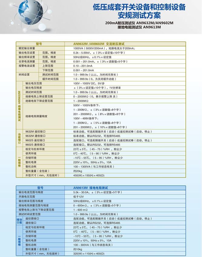產(chǎn)品概述: 艾諾AN9602M耐壓測試儀具備交流耐壓輸出5000VAC/200mA(持續(xù)時(shí)間30分鐘),絕緣電阻測量范圍1~2000MΩ,并能快速準(zhǔn)確的完成上述性能指標(biāo)的測試,精密程控絕緣耐壓測試儀,能滿足各電器、元器件生產(chǎn)廠家和質(zhì)檢部門依照國際和國家安規(guī)標(biāo)準(zhǔn)進(jìn)行上述安全性能檢測的要求。 AN9632M絕緣耐壓測試儀具備交流耐壓輸出5000VAC/200mA(持續(xù)時(shí)間30分鐘),絕緣電阻測量范圍1~2000MΩ,臺(tái)灣絕緣耐壓測試儀,并能快速準(zhǔn)確的完成上述性能指標(biāo)的測試,能滿足各電器、元器件生產(chǎn)廠家和質(zhì)檢部門依照國際和國家安規(guī)標(biāo)準(zhǔn)進(jìn)行上述安全性能檢測的要求。