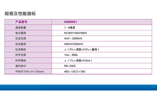 產(chǎn)品簡(jiǎn)介 AN80051多通道時(shí)序紋波測(cè)量?jī)x具有直流電壓紋波和時(shí)序測(cè)試功能,,主要應(yīng)用于各種家電電源、適配器和各種開關(guān)類電源的時(shí)序測(cè)試。