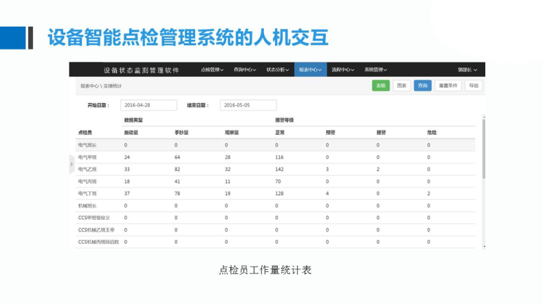 計(jì)劃點(diǎn)檢、臨時(shí)點(diǎn)檢、違規(guī)解釋、違規(guī)統(tǒng)計(jì)、生成計(jì)劃、狀態(tài)統(tǒng)計(jì)、任務(wù)交接