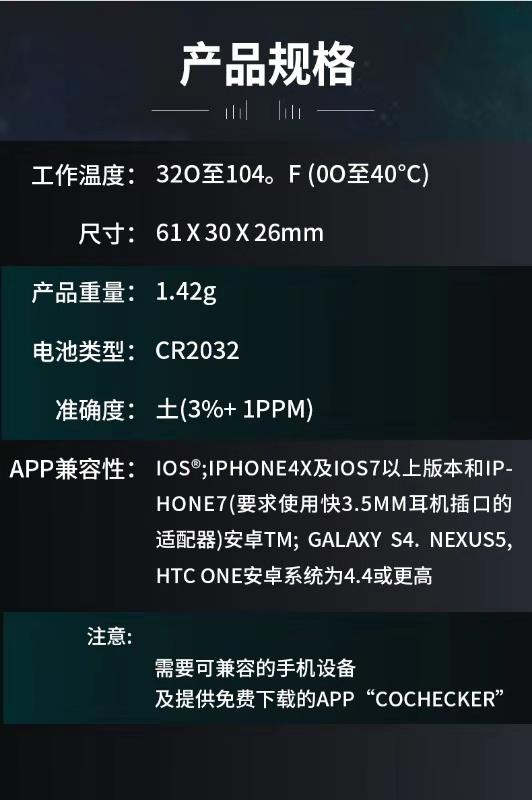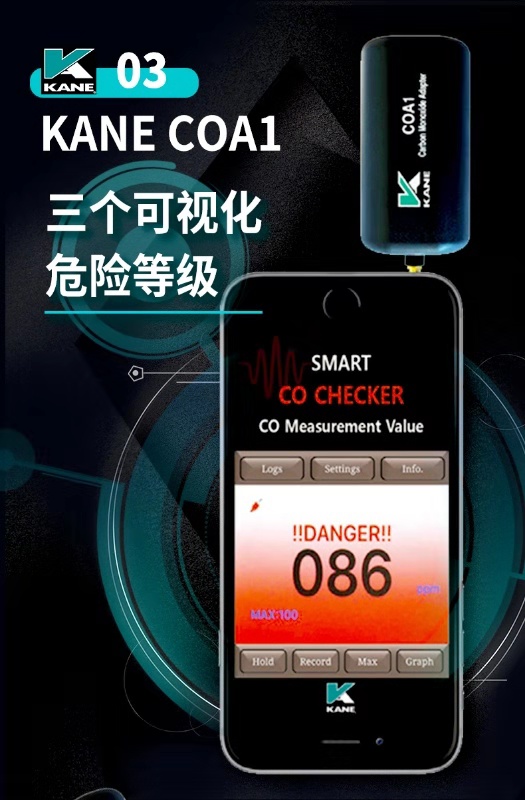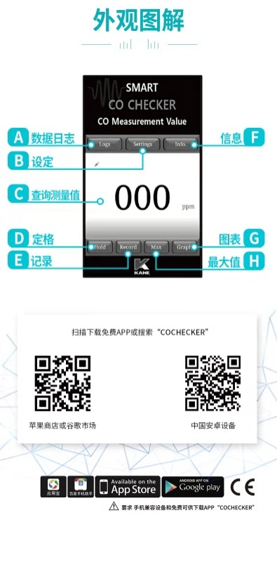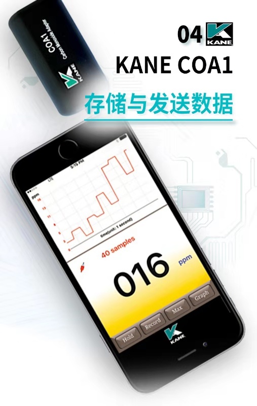 英國KANE凱恩手機銜接一氧化碳探測儀 KANE COA1 一氧化碳探測儀 手機銜接解決方案 • 可探測一氧化碳至1ppm • 一氧化碳讀取至999ppm • 與iOs或安卓系統(tǒng)兼容 • 可在免費APP上顯示3個危險等級 • APP上可以保存數據和發(fā)送郵件數據 • 工作溫度:32O至104℉(0O至40℃) • 準確度:±(3%+1PPM